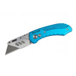 The BlueSpot Professional Folding Utility Knife includes one precision ground SK5 utility blade for increased cutting strength. Handle manufactured from zinc alloy for increased durability. One-handed locking button opens and folds away from the blade for increased safety. Also features a pocket clip for convenient carrying and easy blade change button. Suitable for use with standard utility blades.