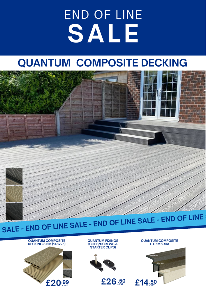 Quantum Composite Decking Clearance Save on selected Quantum composite decking boards in our End of Line Clearance Sale. Composite decking is a durable, low-maintenance alternative to timber decking, ideal for patios, garden decking areas, and outdoor living spaces. This limited-stock clearance offer – once it’s gone, it’s gone. |