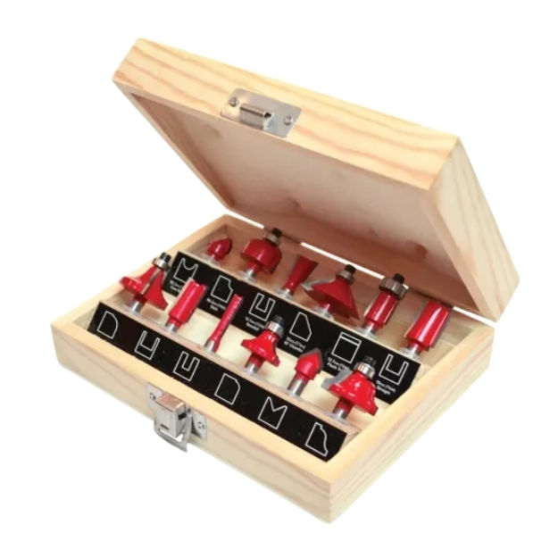 The Faithfull 12 Piece Router Bit Set with 1/4in shank. Tungsten Carbide tips ensure long life and the storage case provides a safe place to store the bits when they are not being used. Different cutter shapes enable the creation of a variety of profiles, grooves and mouldings in softwoods, hardwoods, MDF or plywood. This Set contains 1 x Dovetail: 12.7 x 13mm, 1 x Straight: 6 x 20mm, 1 x Straight: 12 x 20mm,1 x Straight: 16 x 20mm and 1 x Flush Trim: 12.7 x 13mm. This Set also features 1 x Rounding Over: R7.9mm, 25 x 14mm, 1 x Rounding Over: R9.5mm, 28 x 14mm, 1 x Roman Ogee: R4mm, 25 x 12mm, 1 x Core Box: R6.3mm, 12.7 x 10mm, 1 x Cove: R6.3mm, 22 x 12mm, 1 x 45° Chamfer: 32 x 13mm and 1 x 90° V-Groove: 12.7 x 9mm.