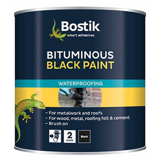 Bostik Bituminous Black Paint is a solvent-based protective coating for external waterproofing and weather protection of ferrous and non-ferrous metals, concrete, roofing felt, fibre cement, corrugated iron, asphalt and wood.It dries to form an odourless and taint-free bitumen film.