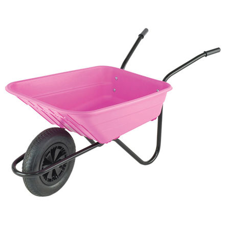 Walsall Wheelbarow Company pink polypropylene wheelbarrow with a pneumatic wheel and steel frame, built to last. This barrow is ideal for gardeners and DIY. Measures 89cm x 60cm x 268cm. Capacity: 90 Litre. Maximum load: 125kg. Made by Walsall Wheelbarrow Company, the only company in the UK making wheelbarrows from scratch.